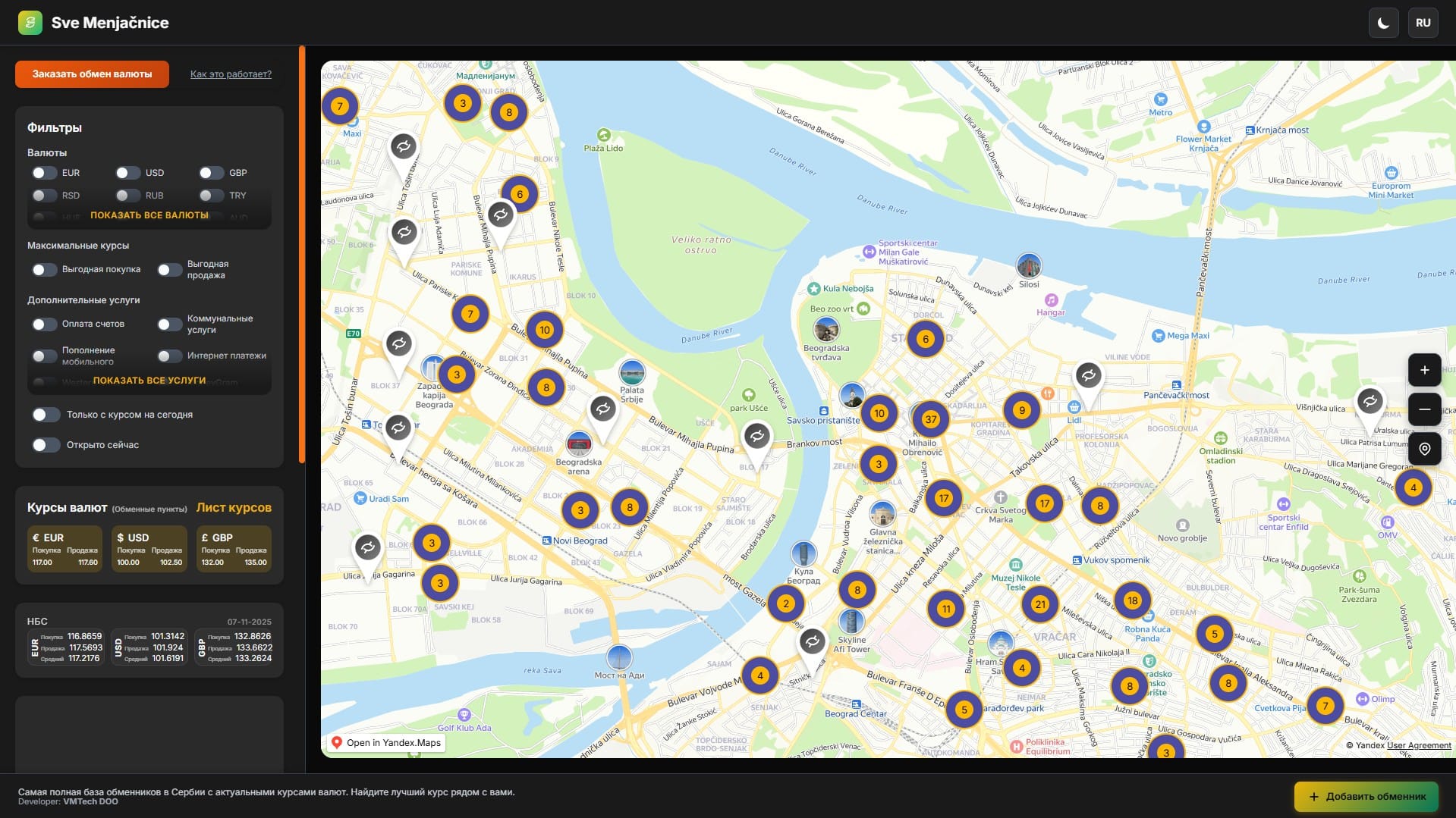 Сегодня ситуация меняется благодаря появлению сервиса SveMenjačnice.rs — агрегатор обменных пунктов Сербии. Вы открываете сайт и видите перед собой карту Сербии, на которой обозначено расположение обменных пунктов, выбрав нужный адрес, вы получаете информацию о текущих обменных курсах в данном обменнике. Информация о текущих курсах валют обновляется ежедневно, а иногда и несколько раз в день (если обменник заинтересован в быстрой покупке или продаже определенной суммы в конкретной валюте, он может оперативно менять ставки, чтобы привлечь клиентов — и это может быть ваш шанс).