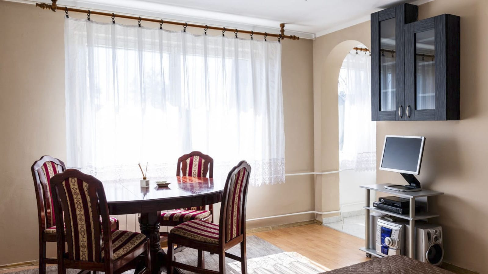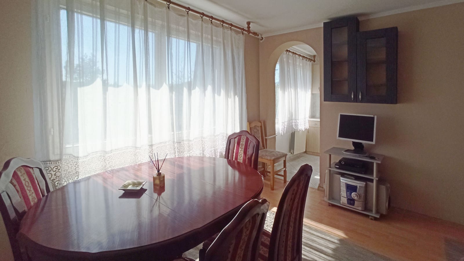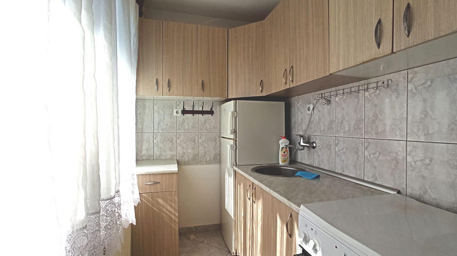 Квартира светлая, и в комнате, и в кухне большие окна с видом во двор.